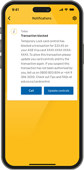 We’ll let you know if your spending goes over the spending limit you’ve set, or if there is an attempt to use a feature you’ve turned off. Just be sure that you have notifications enabled within the ASB Mobile Banking app.