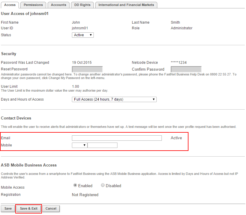 - Add either an email and/or mobile number in the appropriate fields