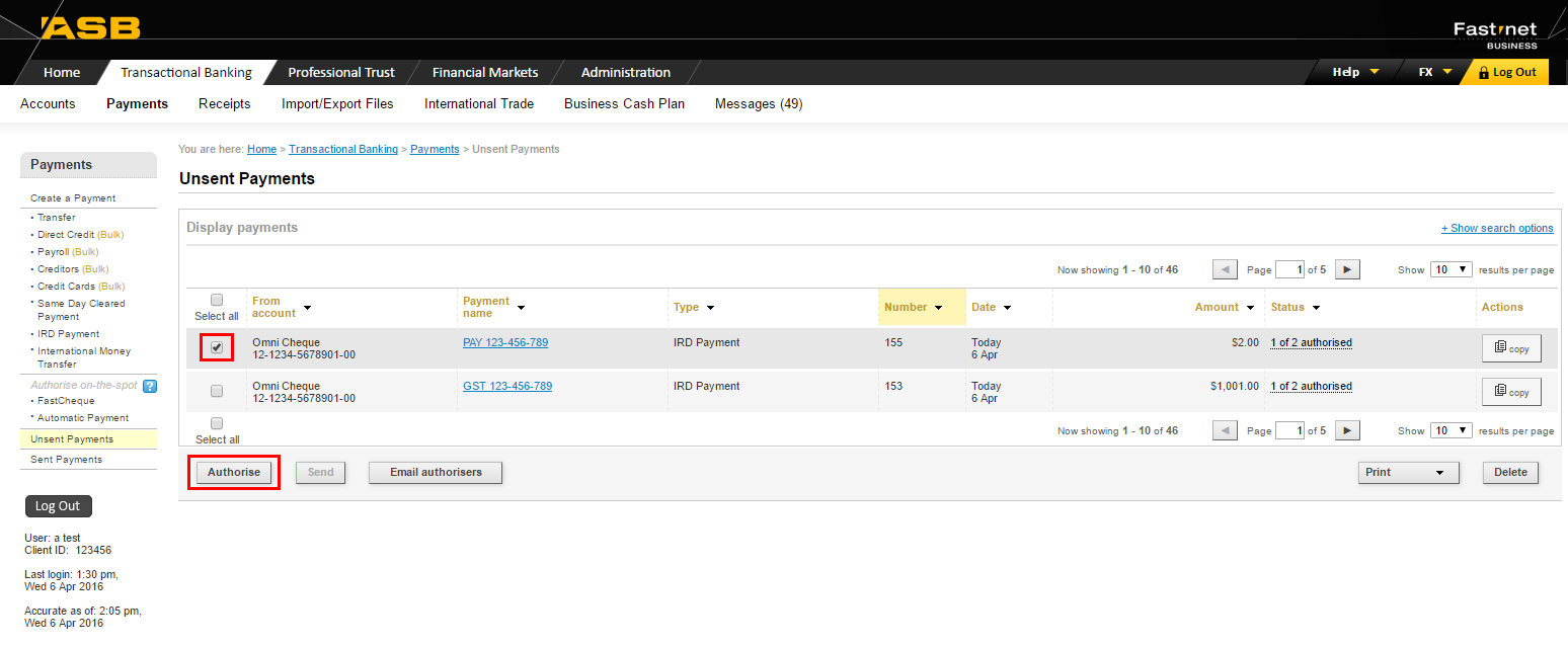 1. Once you save a payment, you can start the authorisation process by selecting the Save and Authorise button on the IRD Payment Details page or selecting Authorise for the IRD payment from the Unsent Payments page.