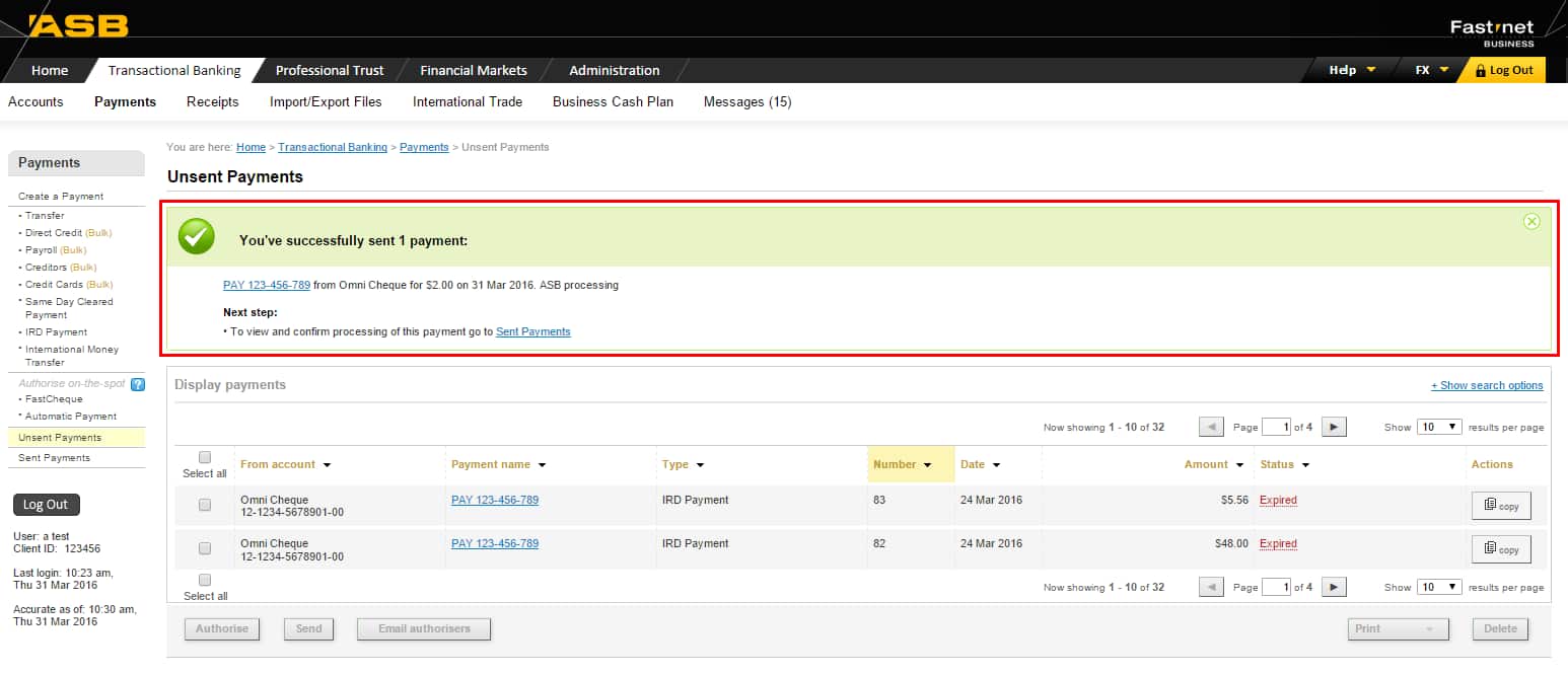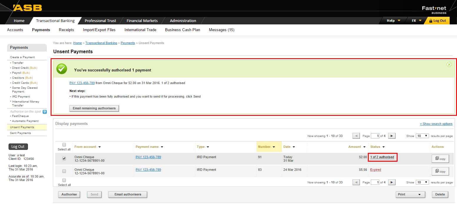 3. You will then be taken to the Unsent Payments page, where you will see a success message and you will see the payment created is displayed in the Unsent payments table with a status of 1 of 2 authorised.