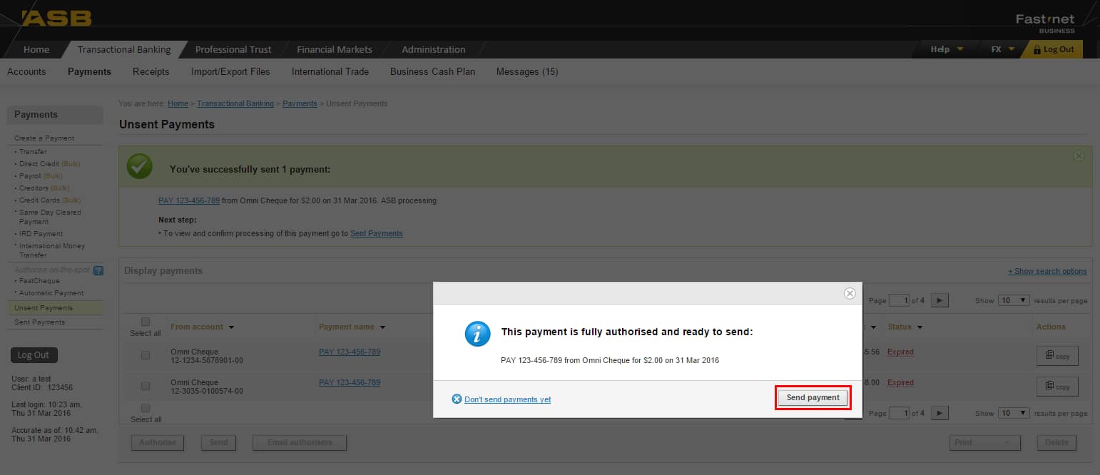5. The user enters their user ID and password and selects the Authorise button, they will see the option to Send payment.