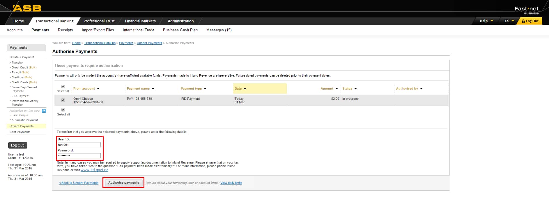 2. On the Authorise Payments page, enter your user ID and password and select the Authorise payments button.