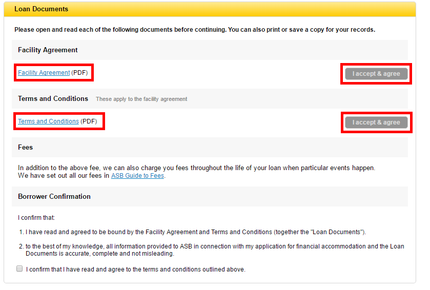 3. Open and review the Facility Agreement and Terms and Conditions pdfs and click the 'I accept & agree' buttons for each document.