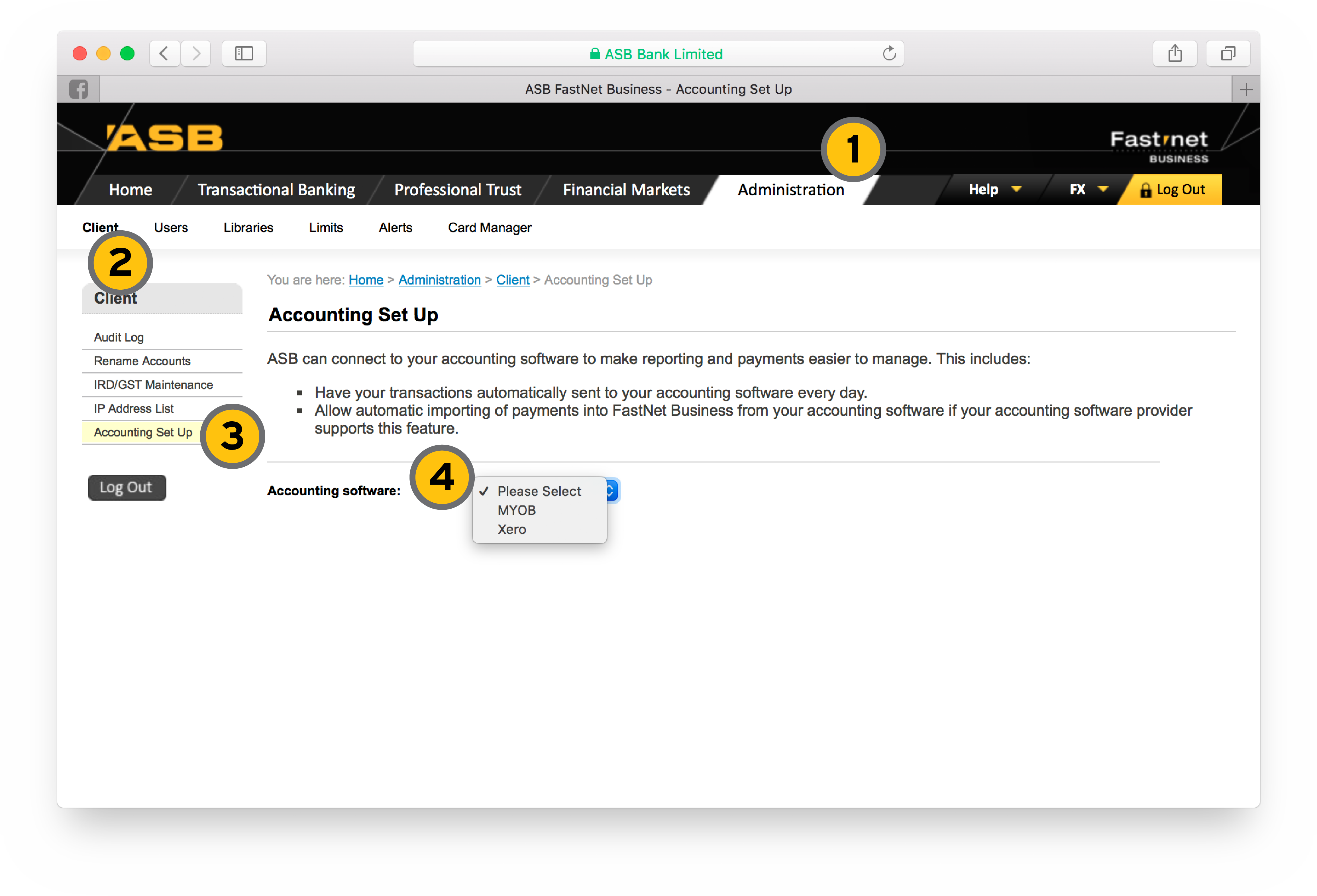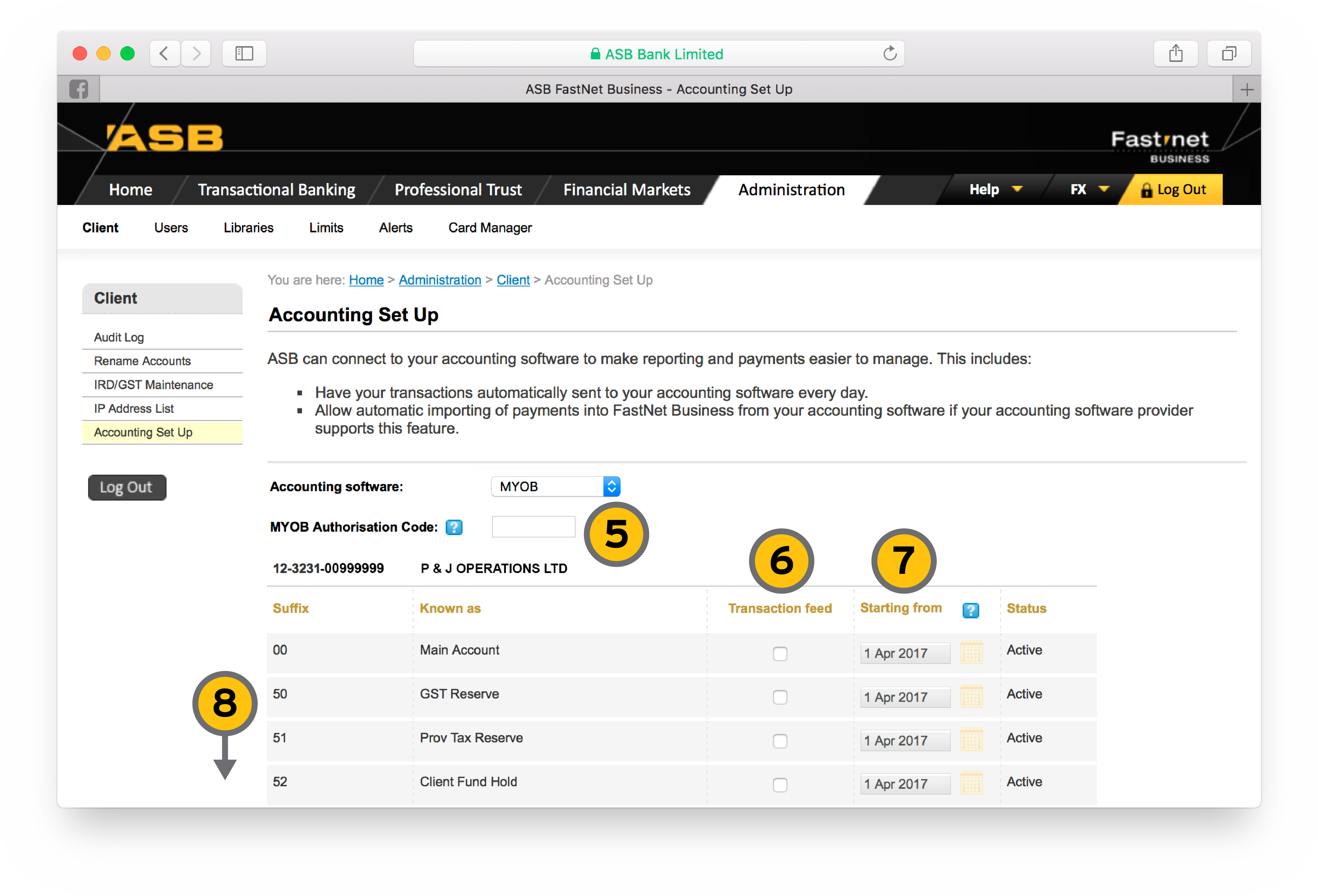 Our account feeds can send your ASB transactions to MYOB every day, automatically. If you use FastNet Business, here's how to set them up online. (If you use FastNet Classic, follow these instructions instead. We also provide transaction feeds for Xero.)